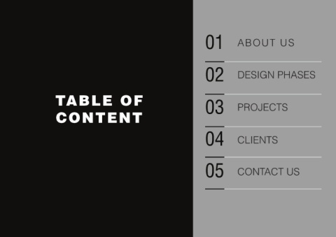 01 ABOUT US 02 DESIGN PHASES TABLE OF 03 PROJECTS CONTENT 04 CLIENTS 05 CONTACT US